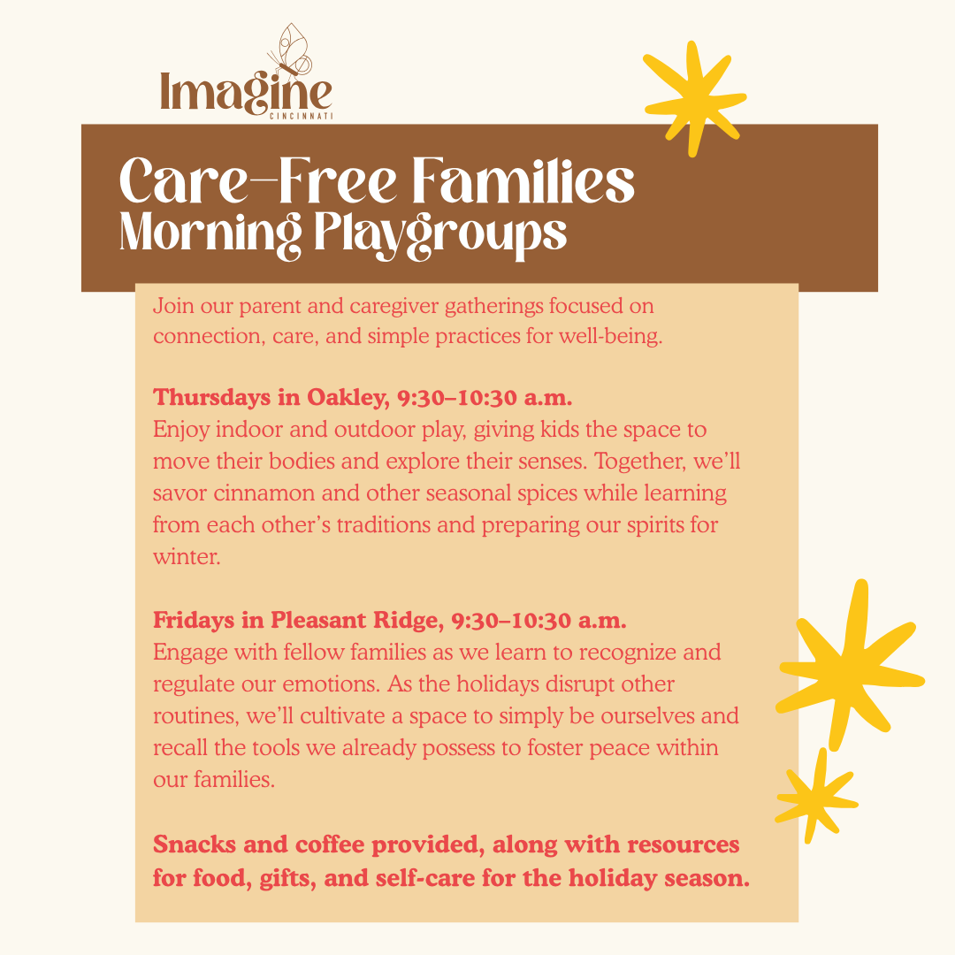 We currently have a family playgroup running in Pleasant Ridge on Friday mornings 9:30-10:30am. You can join us in the backyard of Community Happens Here (6238 Montgomery Rd). Park on the street or at the Walgreens nearby. We move indoors for rain or snow.